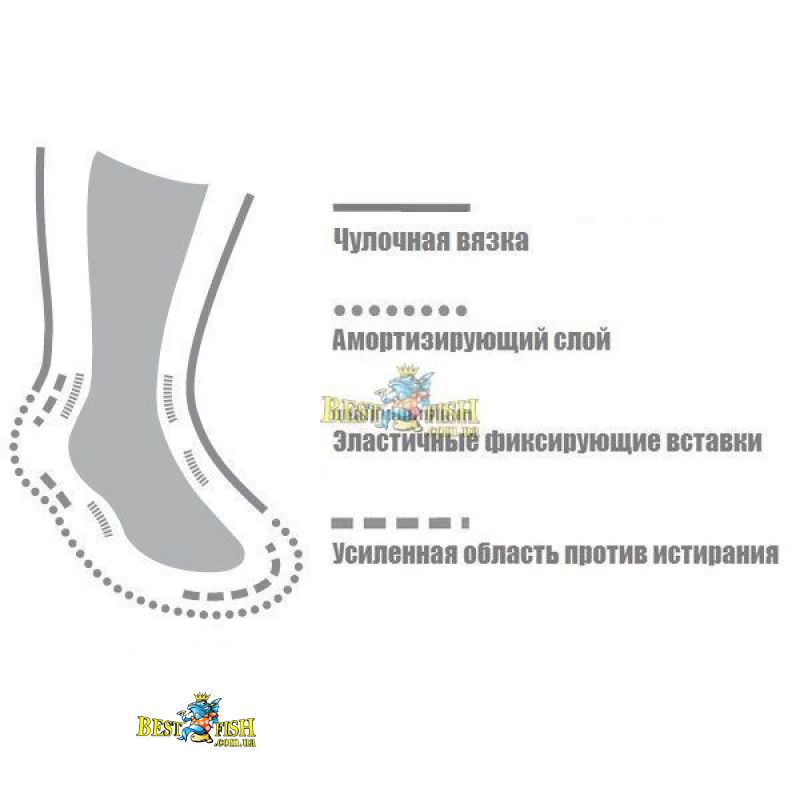 Cushioning sponge cloth - внутренний амортизирующий слой носка, выполненный специальной вязкой в виде петель основных нитей, обеспечивает больший комфорт при ходьбе и защищает ступни, снижая риск травматизма во время занятий спортом. В носках, предназначенных для использования с высокой треккинговой обувью, амортизирующий слой защищает голени ног.
