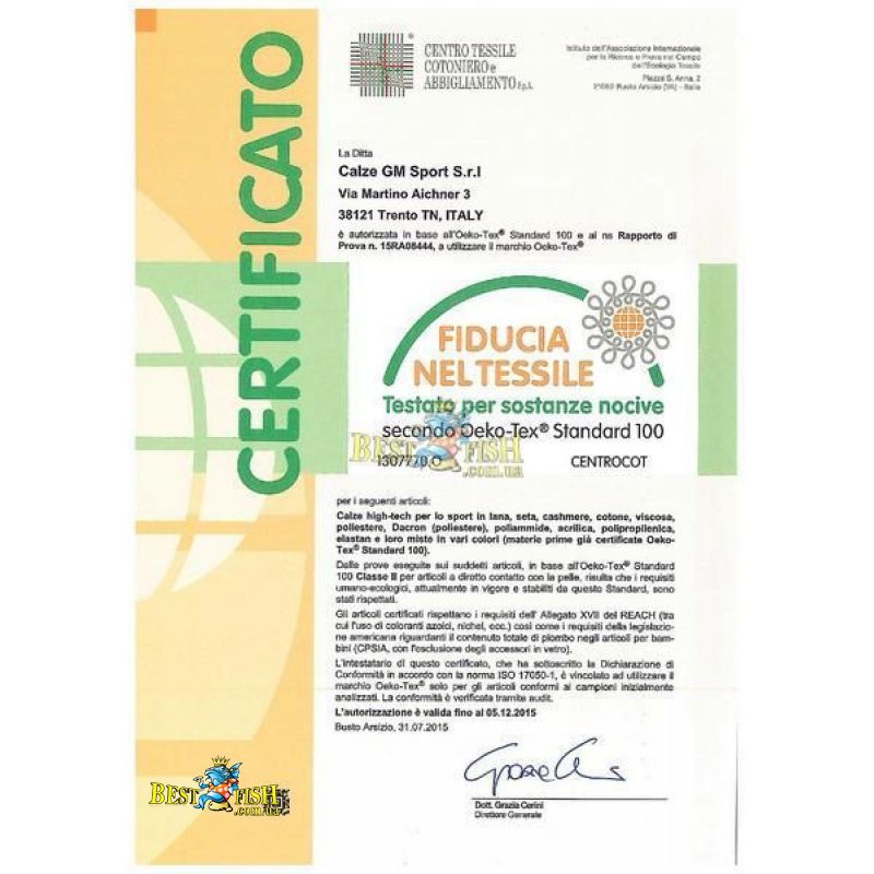 Oeko-Tex Standard 100 - сертификат выдается авторитетной Международной Ассоциацией Тестирования и Сертификации Текстильных Изделий Oeko-Tex, в состав которой входят 17 независимых институтов и филиалов в 40 странах мира. Данный сертификат гарантирует, что продукция Calze GM Sport не содержит канцерогенных, аллергенных, раздражающих и любых других вредных для здоровья человека веществ. Сертификация по данному стандарту является наиболее важной для производителей текстиля во все мире. Calze GM Sport контролирует качество продукции на каждом этапе производственного процесса, использует сертифицированные материалы и строго следует рекомендациям Oeko-Tex.