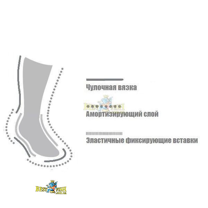 Cushioning sponge cloth - внутренний амортизирующий слой носка, выполненный специальной вязкой в виде петель основных нитей, обеспечивает больший комфорт при ходьбе и защищает ступни, снижая риск травматизма во время занятий спортом. В носках, предназначенных для использования с высокой треккинговой обувью, амортизирующий слой защищает голени ног.