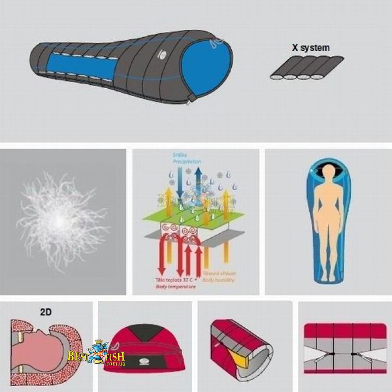 - Система X-перегородок создает изолированные ячейки, препятствующие сбиванию и перемещению пуха в спальнике, обеспечивая тем самым равномерную постоянную термоизоляцию. Система полностью закрытых ячеек позволяет упростить стрику, сушку и уход за спальником. Спальники с X-системой ячеек имеют более простую конструкцию, но обеспечивают меньший вес и объем, по сравнению с Alpha и H системами.