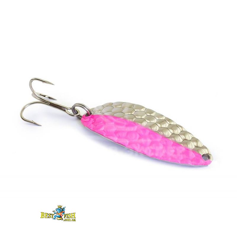 Little Cleo 11.2г Hammered Nickel Pink - вторая по популярности, после кастмастера, блесна в арсенале американского производителя Acme. Блесны выпускаются в огромном количестве размеров и цветов. Самые маленькие успешно ловят форель и белого хищника (жерех, язь, голавль). Блесны размером по больше можно использовать для ловли окуня, щуки, судака и сома. Секрет успеха данной «колебалки» в явно выраженном бугорке в задней части. Благодаря нему блесна производит хаотичные колебания, имитируя движения, находящегося в панике или раненного малька. Она обладает поистине выдающимися полетными качествами и универсальностью. Ведь Клио можно ловить на течении, в морской и стоячей воде.