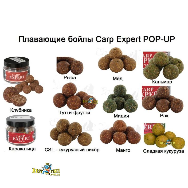 Виготовлені з високою якістю інгредієнтів. Рослинний і тваринний білковий склад є великим делікатесом коропа і білого амура. Плаваючі, насадкові Pop Up Бойл різноманітні і застосовуються в різних умовах лову.