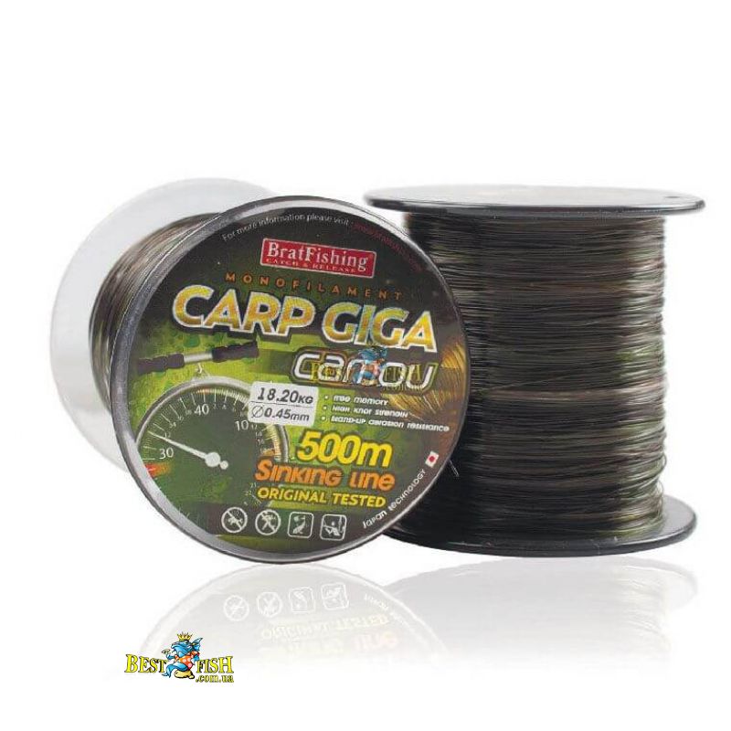 Волосінь Bratfishing Carp giga camou 0.30mm. Серія високоякісних потопаючих лісок нового покоління для коропового лову. Володіє високою міцністю і стійкістю до механічних пошкоджень, відмінно тримає вузлові з'єднання. Має низьку расстяжімость і пам'ять. Колір «камо», що представляє собою суміш чорного, коричневого та зеленого, створює камуфляжний ефект у воді, забезпечуючи тим самим належну маскування волосіні.