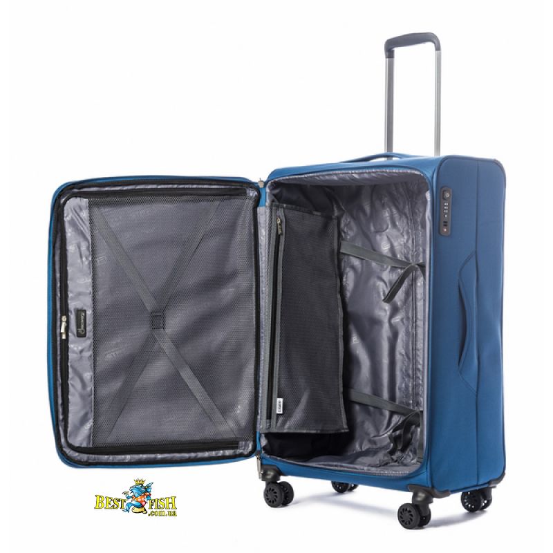 - SOFT SHELL POLYESTER 600D - тканина з поліестеру з товщиною нитки 600D, що має гладку поверхню з відблиском, і з внутрішнє поліуретанове покриття, що захищає вміст валізи від намокання під час дощу середньої інтенсивності. Також тканина має гарну зносостійкість, і не руйнується під дією ультрафіолетового випромінювання.