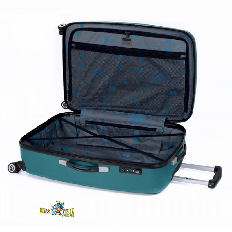 - Чемодан разделен перегородкой на молнии на два основных отделения, перегородка имеет сетчатый карман на молнии