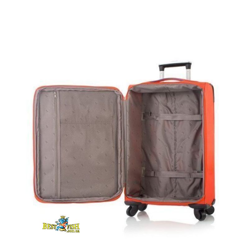 Пара компрессионных ремней помогут зафиксировать внутренний багаж. На фасадной части размещен полноразмерный карман, который удобно расстегивается.
