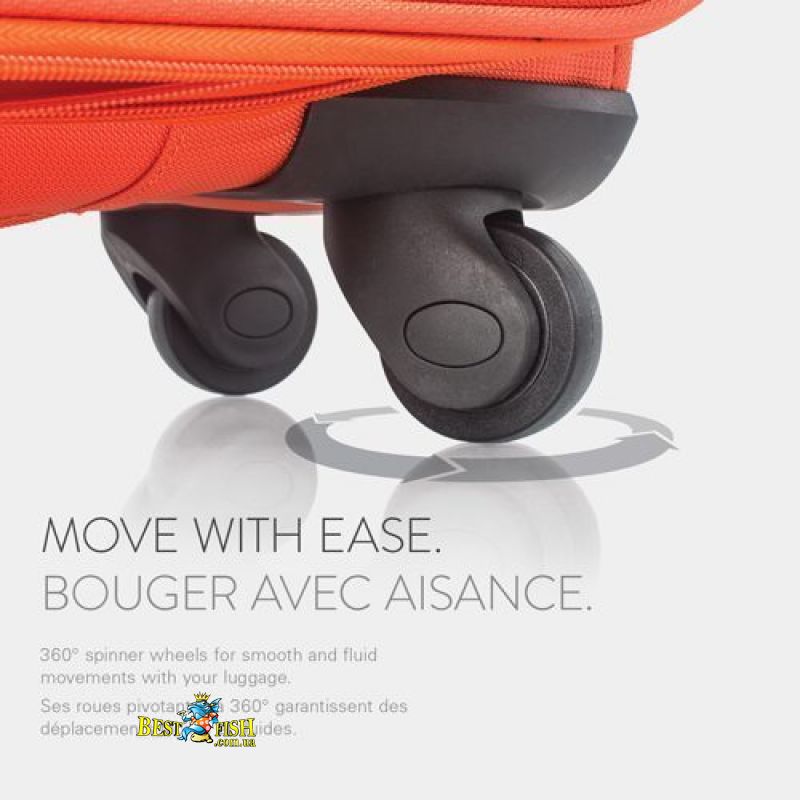 Чемодан оснащен четырьмя полноповоротными колесами системы Spinner с возможностью независимого разворота каждого колеса на 360 °. Системой предусмотрено равномерное перераспределения нагрузки на каждое колесо, что в свою очередь способствует плавному качению и маневренности чемодана, прилагая при этом минимум усилий.