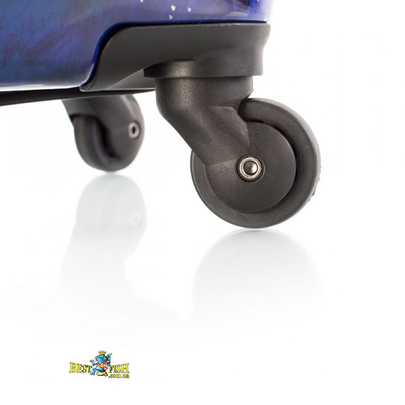 Чемодан оснащен четырьмя полноповоротными колесами системы Spinner с возможностью независимого разворота каждого колеса на 360 °. Системой предусмотрено равномерное перераспределения нагрузки на каждое колесо, что в свою очередь способствует плавному качению и маневренности чемодана, прилагая при этом минимум усилий.