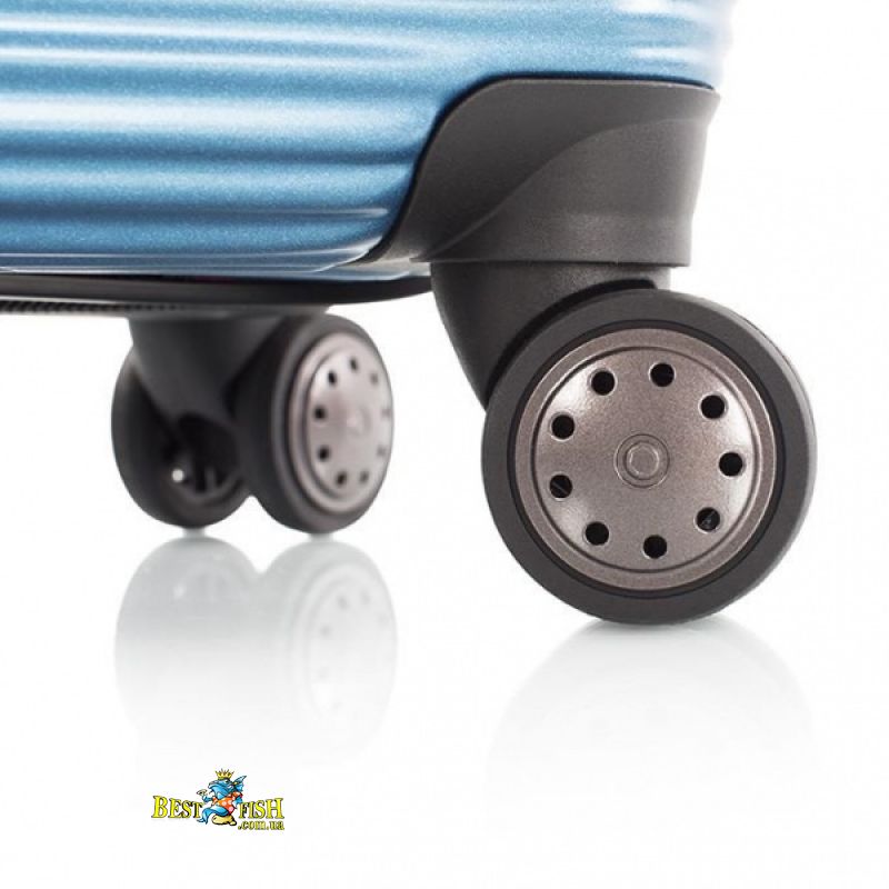 Чемодан оснащен четырьмя, полноповоротными колесами системы Spinner (сделаны в Японии), с возможностью независимого разворота каждого колеса на 360 °. Системой предусмотрено равномерное перераспределения нагрузки на каждое колесо, что в свою очередь способствует плавному качению и маневренности чемодана, прилагая при этом минимум усилий. Также система позволяет быструю смена колес без, задействования сервисного центра.