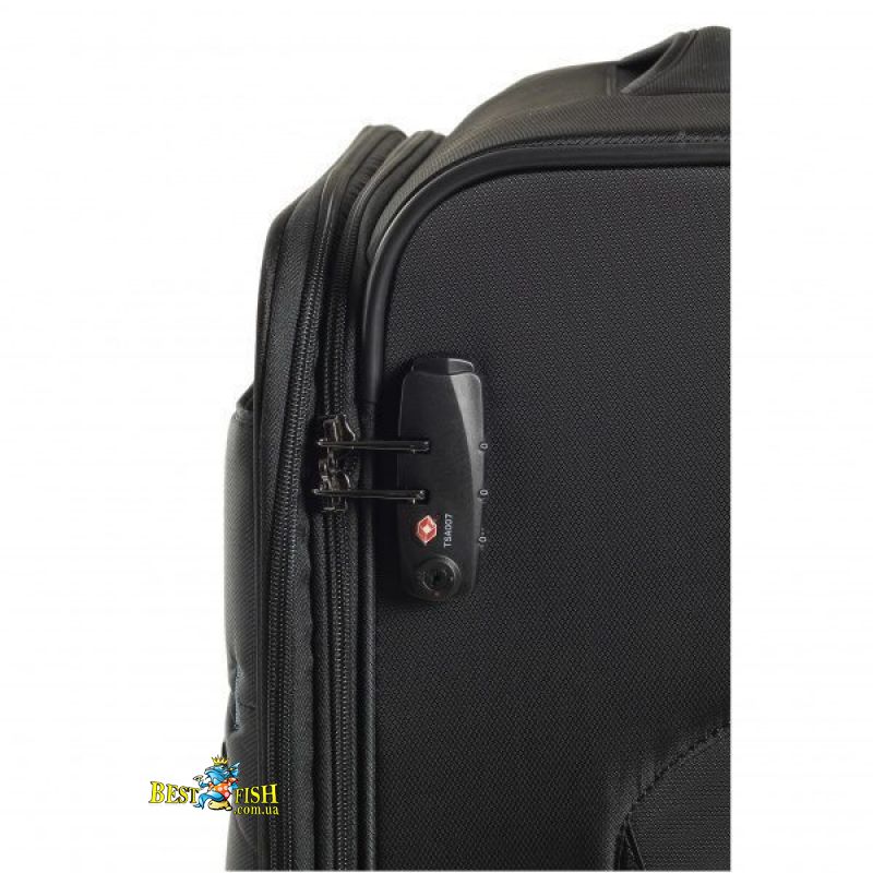 Для большей безопасности вещей предусмотрен удобный кодовый замок системы TSA. Внутри чемодан оснащен компрессионными стяжками и карманом на молнии. Мелкие вещи и вещи первой необходимости можно разместить в фасадном внешнем кармане. Четыре полноповоротных сдвоенных полиуретановых колеса обеспечивают плавный ход и простое управление чемоданом с помощью телескопической ручки, фиксируемой в двух положениях. Для защиты чемодана от внешних повреждений предусмотрена пластиковая защита дна и углов корпуса. Предусмотрена возможность увеличить полезный объем чемодана до 10%, благодаря наличию клапана, расстегнув специальную молнию по периферии чемодана.