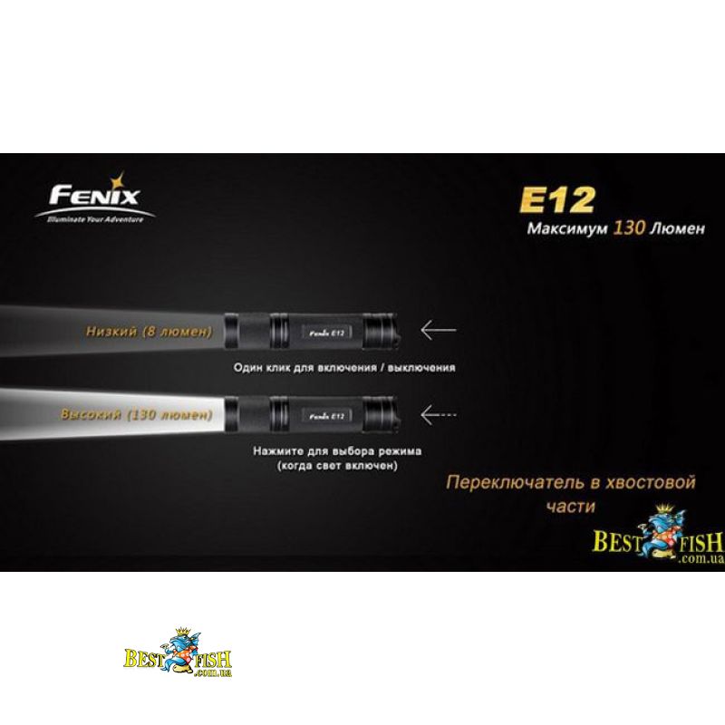 Фонарь-брелок Fenix E12 - компактный, яркий и функциональный фонарь на все случаи жизни. Работает от одной батареи АА и имеет следующие рабочие параметры: световой поток 130 люмен, дальность луча 88 метров и время работы в минимальном режиме 40 часов. Управление фонарем осуществляется кнопкой в хвостовой части этого 9-сантиметрового фонарика: нажатие до щелчка с фиксацией включает/выключает фонарь, легкое нажатие переключает режимы.