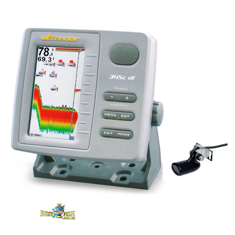 Лучшие C ondor м одели 345cdf и 345cdc с цветным дисплеем с высоким разрешением. Благодаря технике типа „MultiPulse“ с частотами 50/200кГц, Condor 345c df комбинирует впечатляющую глубину зондирования вплоть до 700 м* с очень точным распознаванием рыб на всех глубинах. Модель 342c dc располагает техникой типа „Dual Cone“ с частотами 83/200 кгц и имеет глубину зондирования вплоть до 450м. С высоким разрешением цветной дисплей имеет более 130.560 точек(пиксел) изображения и 65.563 цветов (16 бит кач. цветопередачи). Благодаря технике ТПТ/ЖК изображение на экране кристально-ясное, что в своем великолепии и качестве цветопередачи одинаково с видео игрой. Изображение остается различимым без бленды даже при прямых солнечных лучах или с поляр. очками. Благодаря белой, регулируемой СД-подсветке даже ночью прекрасно читаемо. Пользование Condor 345 / 342 насколько это возможно упрощено. Специально интуитивное управление меню прибора позволяет опробовать его функции. Благодаря понятному строению никогда не возникнет беспокойства, что потеряешся в меню. Комбинация 6-ти кнопок управления и овальный „Cursor“ делают все функции и меню очень простыми и удобно досягаемыми. Все установки, которые производят, сохраняются в устройстве даже после выключения. Если Вы снова включаете устройство, сделанные установки не теряются. Нажатием кнопки +/- Вы выбираете автоматический или ручной режим, при этом не нужно открывать меню. УЗ датчики двойной частоты (в комплекте поставки) 345c df и 342c dc благодаря обтекаемой форме можно использовать при высоких скоростях движения лодки, до 40 узлов. Встроенный датчик температуры выдает непрерывные сообщения о температуре воды.