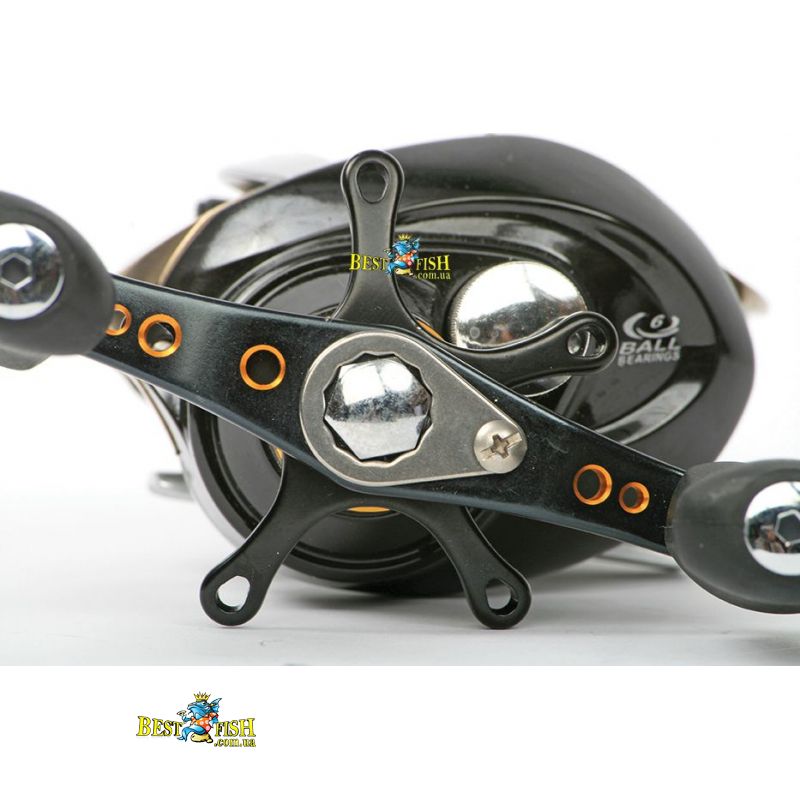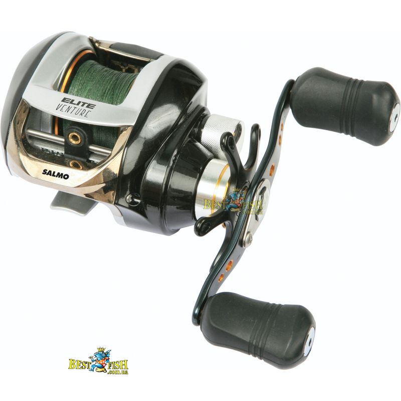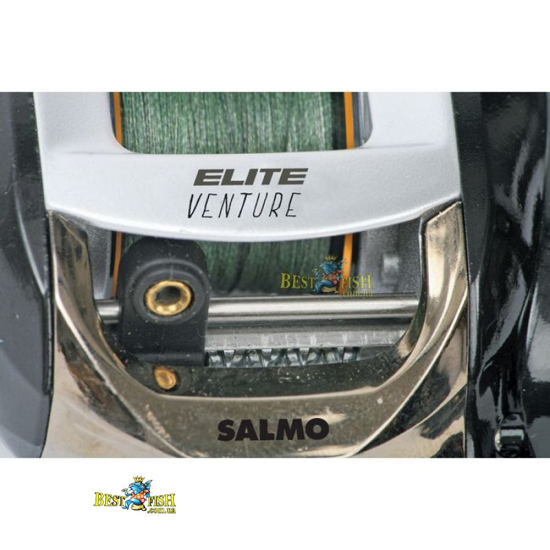 Mультіплікаторная котушка SALMO ELITE VENTURE. Високоякісна низкопрофильная мультиплікаторна котушка під ліву руку. Шпуля розблокується легким натисканням клавіші FAST CAST. Щоб уникнути утворення «бороди» при закиданні, в котушці встановлено гальма: механічний осьової і 6-ти позиційний відцентровий гальмо тонкої настройки. Лесоукладиватель з покриттям нітридом титану, при закиданні приманки є статичною. На котушці встановлено механізм хрестоподібної укладання волосіні, завдяки якому волосінь не провалюється між раніше намотаних витками. Всі підшипники котушки виконані з нержавіючої сталі. Полегшена шпуля виготовлена зі спеціального алюмінієвого сплаву. Збалансована подвійна рукоятка з ручками з гуми. Котушка призначена для лову на приманки середньої величини.