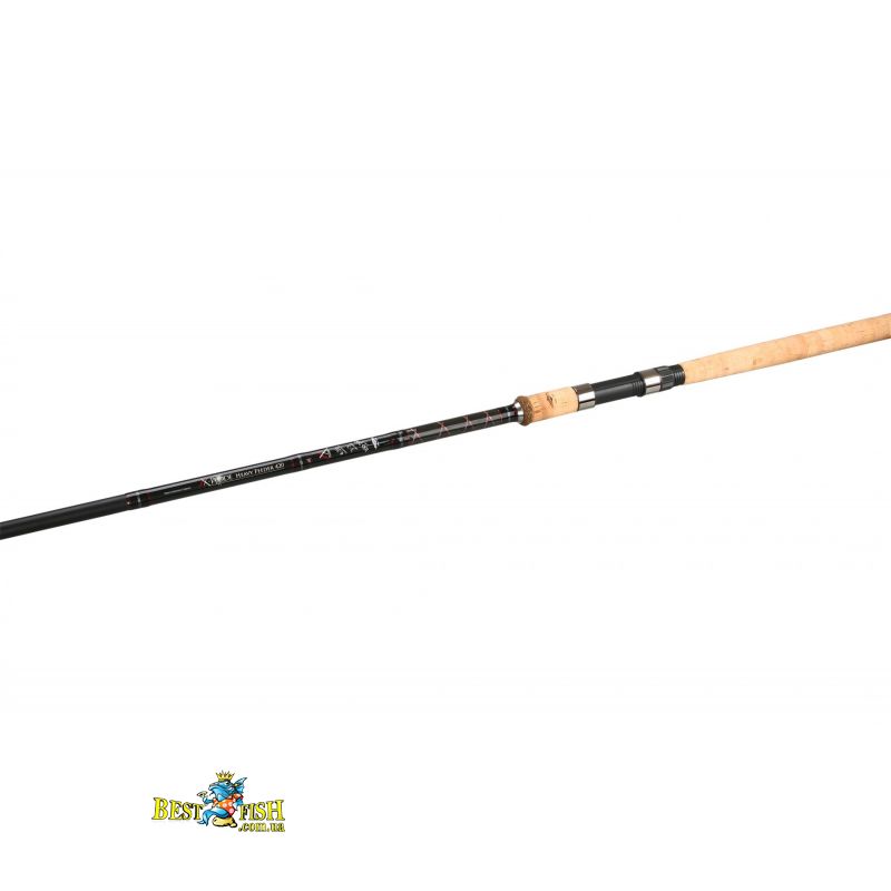 Вражаюче потужний фідер для лову в екстремально жорстких умовах. Ідеально підійде наприклад для лову весняної плотви на Десні. Бланк вудлища виготовлений з високомодульного карбону, має швидкий лад і високу жорсткість. На бланку встановлені кільця зі вставками SiC, діаметр вхідного колечка 18мм. Вудилище комплектується трьома змінними вершинками різної жорсткості. 2 вершинки виконані з карбону, одна зі склопластику. Посадковий діаметр вершинок 3,5мм.