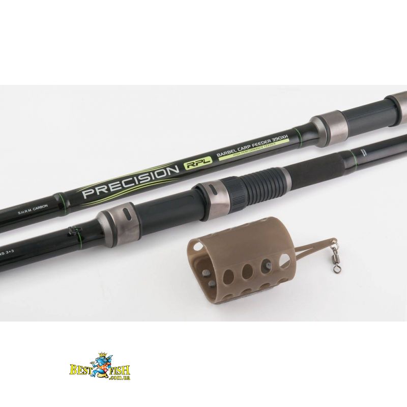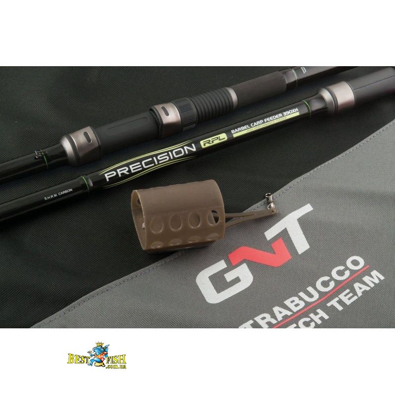 Фідера Trabucco Precision RPL Barbel & Carp Feeder зроблені з карбону SHMR, стійкого до перевантажень і механічних пошкоджень. Вони здатні кидати важкі, об'ємні годівниці на великі відстані. Стики бланка посилені перехресної карбонової обмоткою, що не вплинуло на ідеальну криву вигину при закиданні. Для полегшення загальної ваги вудилище забезпечено розділеної руків'ям з EVA. На вудилище встановлені двоопорні кільця зі вставками SiC, що дозволяє ловити на плетені шнури. Катушкодержатель гвинтового типу з задньої гайкою дозволяє встановлювати більше (коропові) котушки. В комплекті 2 змінні вершинки різної жорсткості.