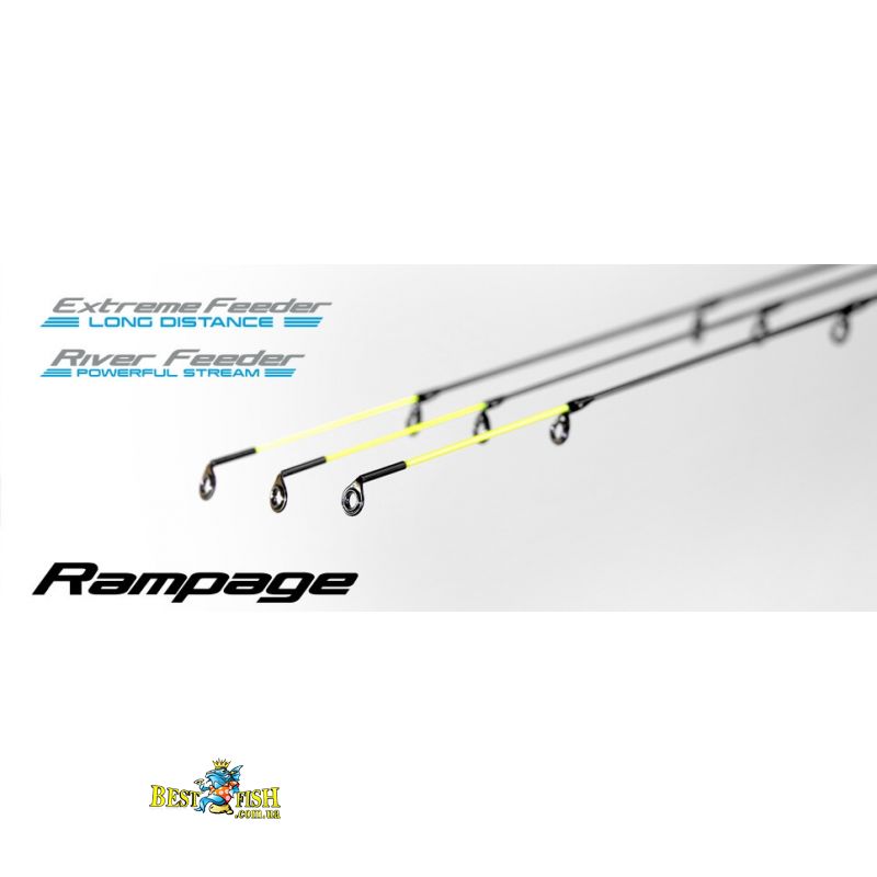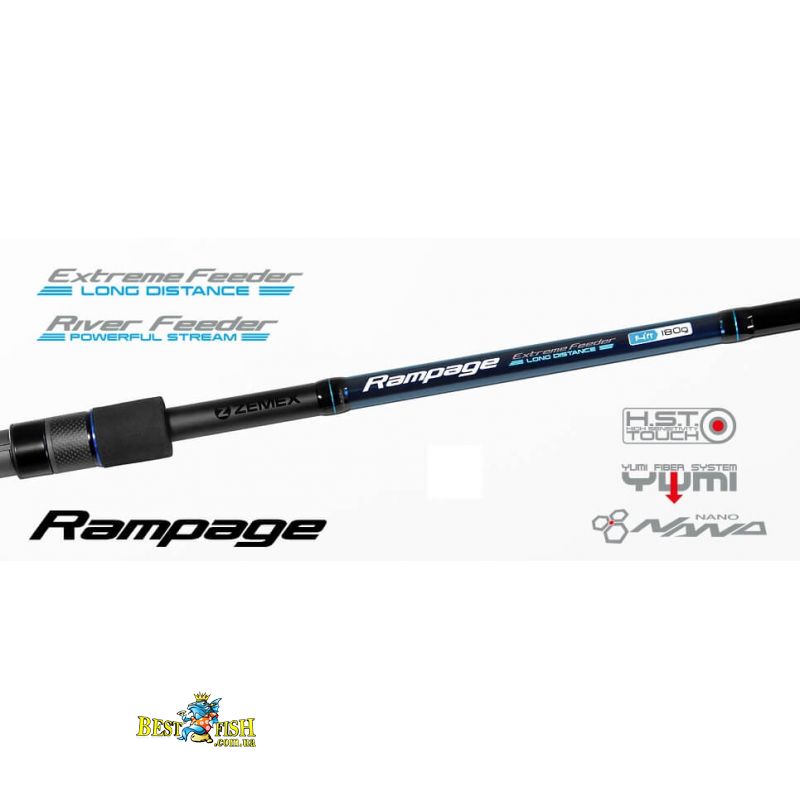 Жорсткий і чутливий бланк вудилища Rampage River Feeder має мінімальний діаметр і мала вага (263г.), Володіє винятковими кидковими і в'яжучі властивості що є цінним для далекого, точного і хльосткого закидання. Таких показників вдалося досягти за рахунок використання "YUMI System" - складної технології переплетення і укладання під різними кутами ниток карбонового волокна і в'яжучих речовин. А запатентована технологія "NANO" дозволяє посилити бланки в місцях найбільших навантажень за рахунок своєрідної захисної сітки з багатокомпонентної гібридної смоли до складу якої входять WXW-волокна.