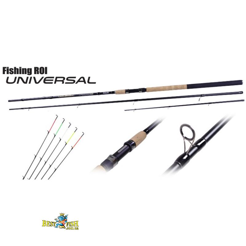 Вудилище Fishing ROI Universal feeder - серія фідерних вудлищ представлена в трьох довжинах з високомодульного графіту з вершинками різної жорсткості (5шт). Бланк має медіум ладом, що забезпечує високу точність і посилістость при закиданні. У порівнянні зі своїми конкурентами, фідерне вудилище характеризується прекрасними показниками дальності закидання оснасток, завдяки чому якнайкраще підійдуть для лову на великих акваторіях, де одним з важливих вимог є дальність і точність закидання. Ідеальна балансування бланка забезпечує не тільки далекобійність, але і прекрасно в'яже рибу, не даючи шансу на схід. Всі вудилища серії оснащені високоякісними кільцями з протівозахлестнимі вставками, надійними Катушкодержатель і комбінованими ручками з пробки і матеріалу EVA. Відмінно працює при виведенні крупної риби.