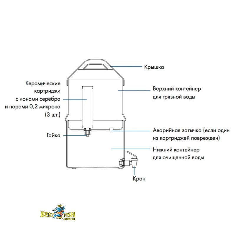 Технология: гравитационный керамический фильтр (поры 0,2 микрона).