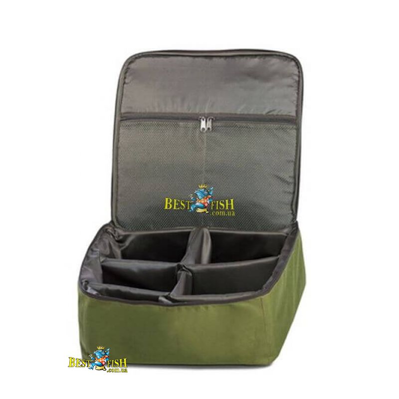 Даний футляр від компанії Kibas складається з чотирьох центральних відділів для зберігання котушок розміром до 6000 і двох додаткових кишень для запасних шпуль і аксесуарів. Також на кришці два розділених кишені з сітки з блискавкою для дрібниць і аксесуарів.
