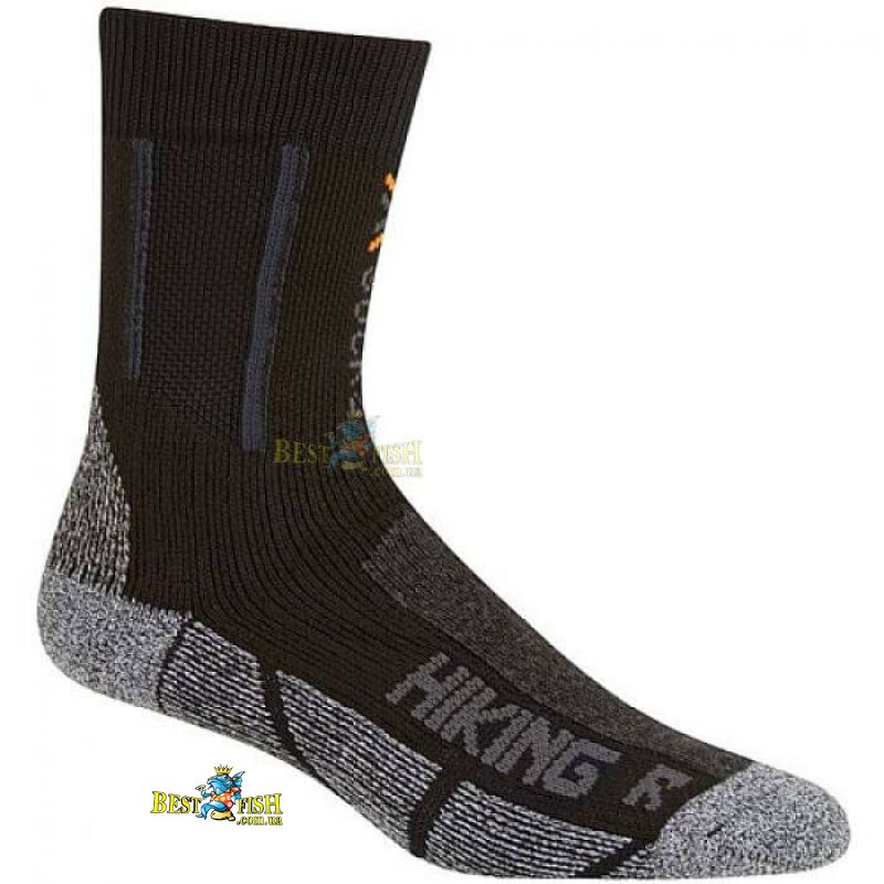 Шкарпетки для нетривалих гірських подорожей. Ви хочете отримати задоволення і відчувати себе комфортно навіть на важкому маршруті і при несприятливих погодних умовах? Такий комфорт надають шкарпетки X-Socks® Hiking з 10-ти зональної системою амортизації, захисту та вентиляції ніг від мізинця до гомілки. Відмінна фіксація носка на нозі без можливості зісковзування і зміщення забезпечується завдяки технологііSelf-adjusting cuff з екстра-широкої еластичною гумкою AktivBund®. Широка резинка рівномірно розподіляє тиск тканини на шкіру виключаючи здавлювання капілярів і не порушуючи кровопостачання протягом тривалого часу. Дихаюча тканина шкарпеток еластична, зносостійка і приємно прилягає до тіла. Система повітряної вентиляції із застосуванням повітряних каналів AirConditioning Channel® забезпечує ефективний клімат-контроль ніг (підтримується постійна і оптимальна температура 37С), відведення вологого повітря і перешкоджає утворенню мозолів і потертостей. Бактеріостатична тканину Skin NODOR® перешкоджає розмноженню бактерій і поширенню неприємного запаху поту. Має гарну повітропроникністю, зносостійка, еластична і м'яка на дотик. Багатоцільова тканину Robur ™ складається з порожнистих волокон з герметичною повітряною камерою. Тканина дихаюча і еластичний. Захищає від ударних навантажень і тиску. Застосовується в зонах, особливо схильних до утворення потертостей і саден - ахіллове сухожилля, підошва, гомілковостопний суглоб, гомілка. Тканина Robur ™, зіткана з трижильний плетеної нитки, надзвичайно міцна і зносостійка. Mythlan ™ - ультра легкий, дихаючий матеріал з мікроволокнистого структурою. Найлегший серед високотехнологічних матеріалів. Тканина Mythlan ™ не накопичує вологу і сприяє ефективному процесу її випаровування з зовнішньої поверхні. Має нейтральне значення pH і гіпоалергенна.