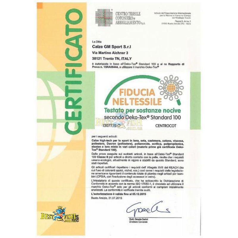 Oeko-Tex Standard 100 - сертификат выдается авторитетной Международной Ассоциацией Тестирования и Сертификации Текстильных Изделий Oeko-Tex, в состав которой входят 17 независимых институтов и филиалов в 40 странах мира. Данный сертификат гарантирует, что продукция Calze GM Sport не содержит канцерогенных, аллергенных, раздражающих и любых других вредных для здоровья человека веществ. Сертификация по данному стандарту является наиболее важной для производителей текстиля во все мире. Calze GM Sport контролирует качество продукции на каждом этапе производственного процесса, использует сертифицированные материалы и строго следует рекомендациям Oeko-Tex.