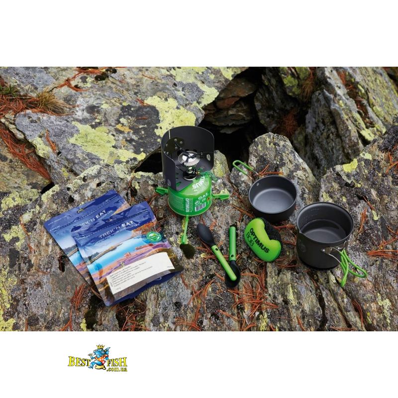 В набор входит легкая и компактная горелка Crux Lite, комплект посуды с теплообменником Terra Weekend HE Cookset, съемная ветрозащита и автономный пьезоподжиг.
