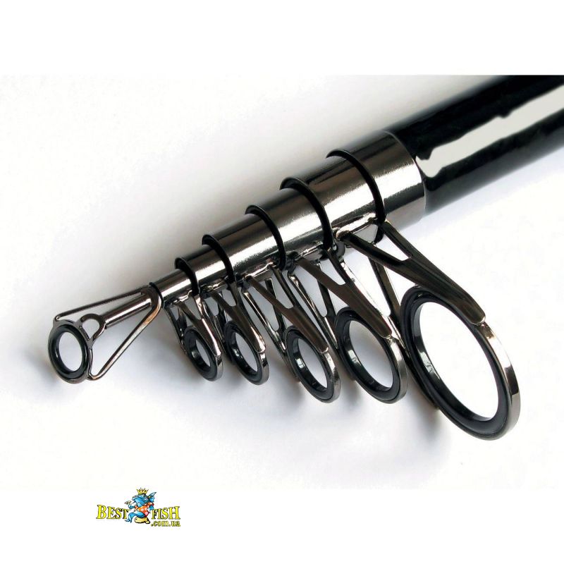 Телескопічний коропове вудилище з транспортировочной довгою всього 84см. Ідеально в тих ситуаціях коли немає можливості перевозити довгі штекерні вудилища. Бланк вудлища виготовлений з HM Carbon і посилений переплетенням. На вудилище встановлені кільця SIC. Рукоять має протиковзке покриття.