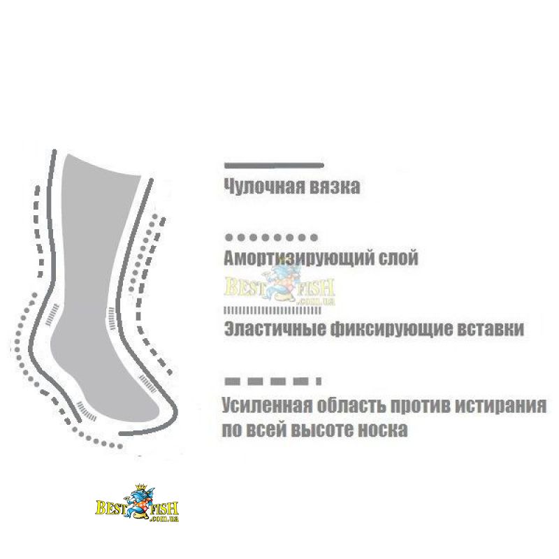 Cushioning sponge cloth - внутренний амортизирующий слой носка, выполненный специальной вязкой в виде петель основных нитей, обеспечивает больший комфорт при ходьбе и защищает ступни, снижая риск травматизма во время занятий спортом. В носках, предназначенных для использования с высокой треккинговой обувью, амортизирующий слой защищает голени ног.