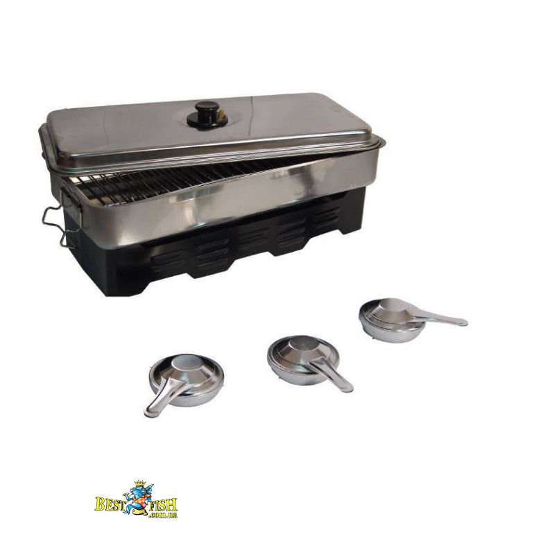 Перед тем как приступить к процессу копчения, необходимо собрать коптильню Voyager . Для этого нужно установить основу коптилки, и поместить 2 горелки в отделения круглой формы, предназначенные для них, предварительно наполнив горелки некоторым количеством жидкости для розжига, которая продается в любом супермаркете или заправке. Затем берем контейнер из нержавеющей стали, в который помещается продукт для копчения. На дне имеется овальное углубление, куда необходимо насыпать равномерным слоем 3-4 столовых ложки опилок. Горелки нагревают дно, опилки начинают тлеть, так образовываться дым, нужный для копчения. Сверху опилок ставится поддон для сбора жира, затем устанавливается решетка, на которую кладется рыба. Затем все это накрываем крышкой. Поджигаем горелки, ставим контейнер сверху основы, периодически проверяя готовность продукта. Количество выходящего дыма можно регулировать пропускным клапанам на крышке. 2 большие горелки распределяют жар постоянно и равномерно. С плотно закрываемой крышкой. Время копченияпримерно 20 минут (рыбу необходимо почистить, немного обсушить). Во внутрь можно втереть микс из соли-сахара, перец, чуть коньячка и зелень (по желанию). Предварительно рыбка должна полежать и просушиться день в сухом холодном месте. Потом встряхнуть с рыбы все специи и уложить в коптильню. Муку опилочную использовать обязательно. Рыба получается очень нежной и сочной. Легко чистится. Готовить можно не только рыбу но и птицу. Работает на жидком топливе. Идеально подходит как для копчения на природе, так и в домашних условиях. Размеры в сложенном виде (без подставки): 50*24.5*14 (см)