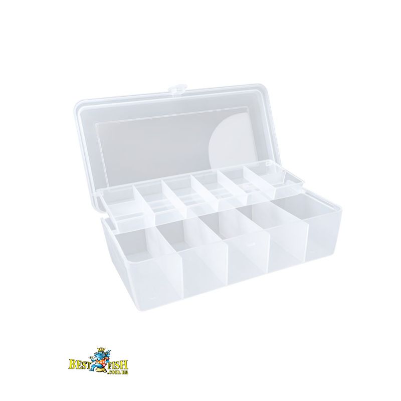 Коробка має два рівні. Коли ви відкриваєте коробку, верхній лоток висувається знизу, і ви можете покласти дрібні предмети. Прозора. Виготовлена з пластику, який витримує шкідливі сонячні промені. Розміри: 20x10x6 см.