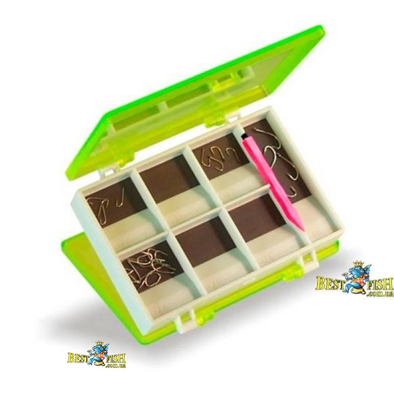 Двухсторонняя магнитная коробка для крючков на 13 отделений, магнитный карандаш в комплекте. Каждый отсек имеет наклонную плоскость для удобного доставания крючков из коробки.