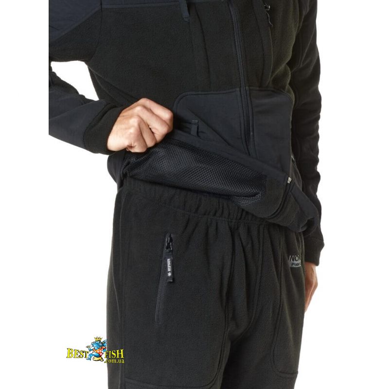 М'який, міцний. Куртка з високим коміром і блискавкою, має два теплих бічних карма на для зігріву рук, в нижній частині куртки є регулювання-стяжка з фіксаторами для додаткового захисту від вітру і холоду. Штани мають еластичний пояс і дві кишені на блискавці. Ідеально підходить для відпочинку на природі.