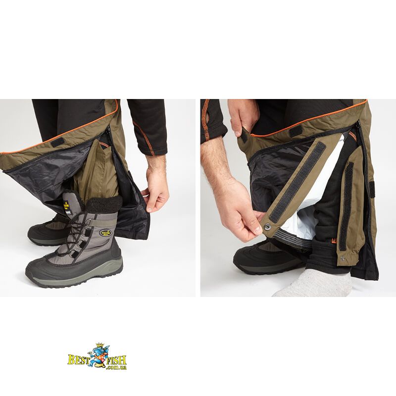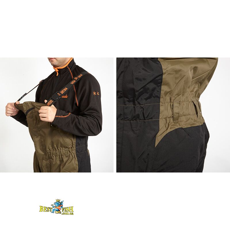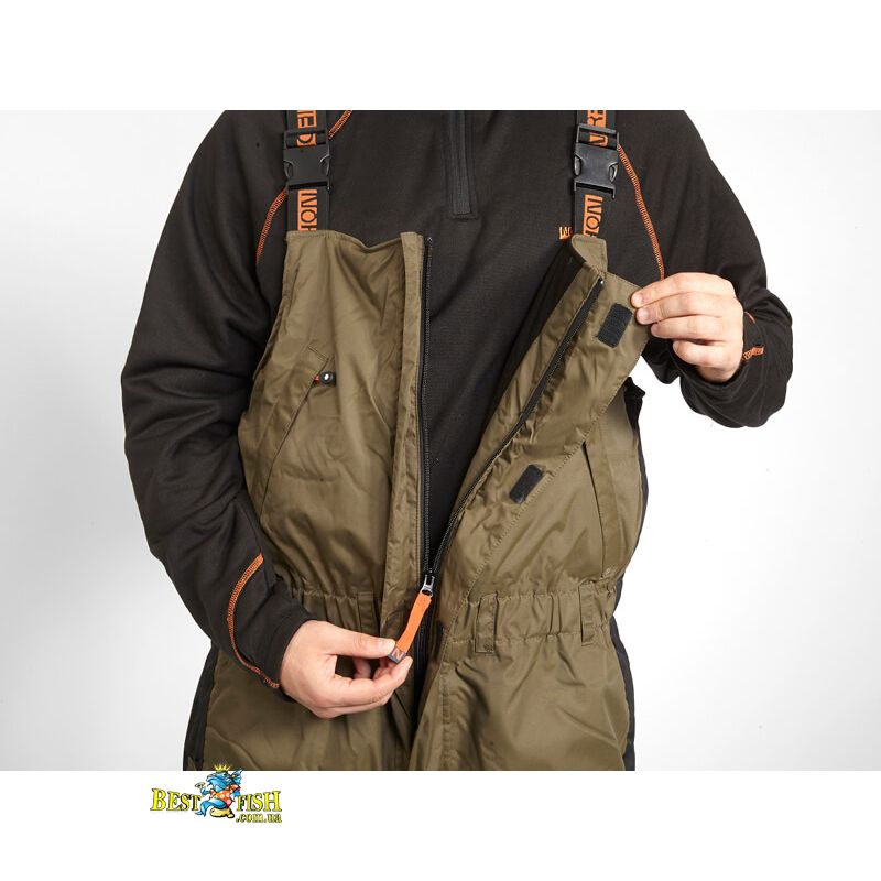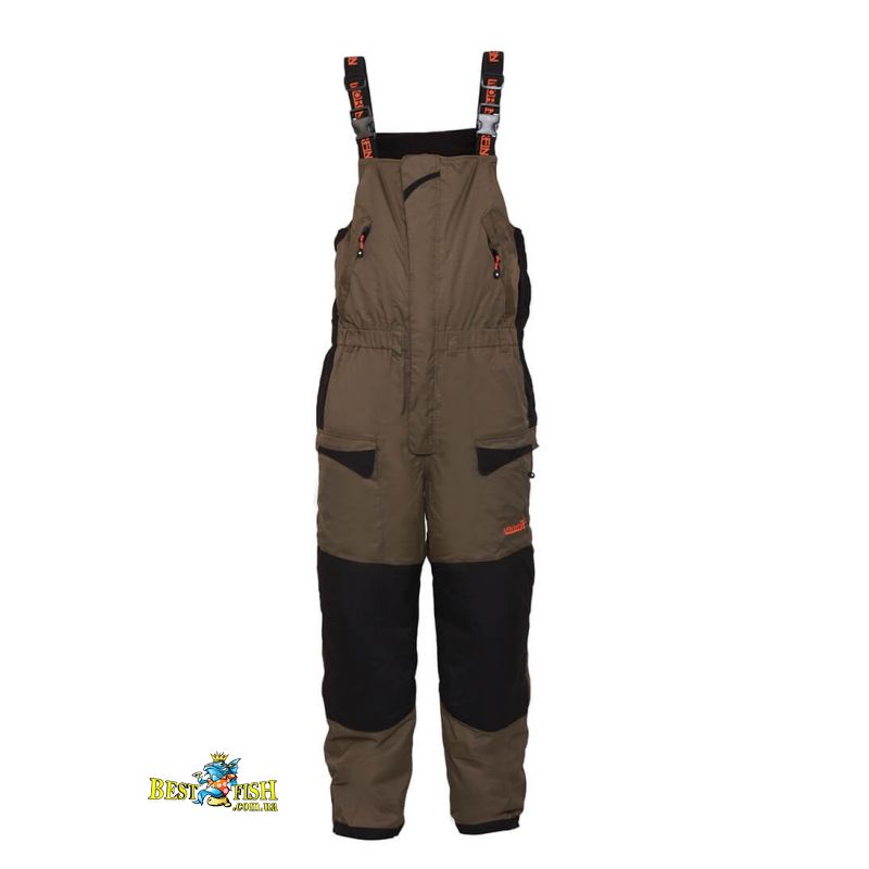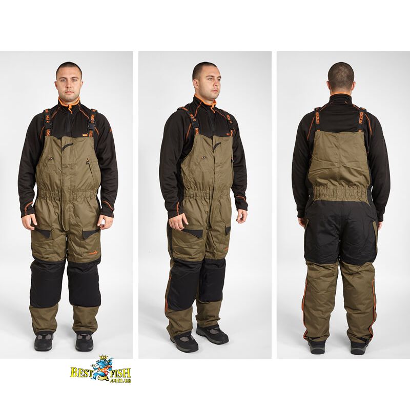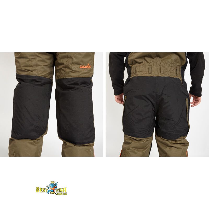 Напівкомбінезон в Norfin Discovery оснащений регульованими лямками і великим нагрудною кишенею. В районі колін і сідниці комбінезон отримав додаткове ущільнення спеціальними вставками. Для перенесення не крупніше снастей можна використовувати два накладних кишені на штанинах комбінезона.