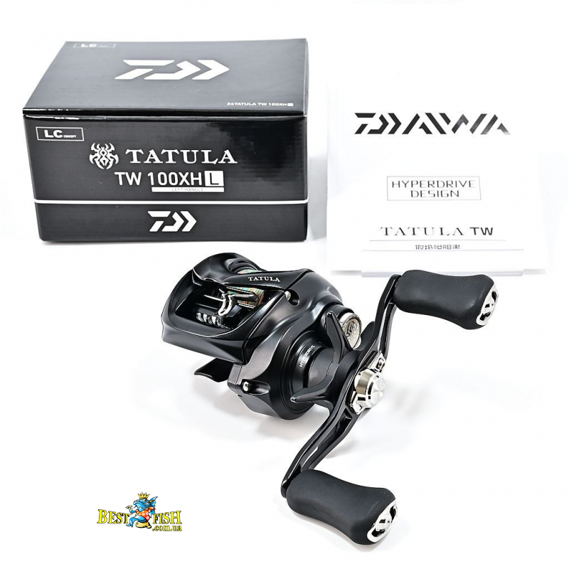 Daiwa 24 Tatula SV TW 100XHL (10717-102) — мультиплікатор японського бренду Daiwa серії Tatula SV TW. Tatula SV TW 100XHL — надшвидка Tatula SV. XHL 8.1:1 — надшвидка передача на SV-платформі для турнірного твічингу. Корпус зібрано з фірмових матеріалів Daiwa — Zaion-композит або алюміній Hyper Magnesium залежно від моделі. Головна пара Hyper Tough Digigear з посиленим зачепленням зуба, що відрізняє преміальну серію від середньої. Фрикціон UTD (Ultimate Tournament Drag) або звичайний Star Drag з карбоновим пакетом — максимальний тиск 5-7 кг. Підшипникова група (8 шт.) включає нержавіючі CRBB у критичних вузлах. Літерні суфікси позначають: L — Left Hand (ліворука), HL — High Gear Left, HSL — High Speed Left, XHL/XSL — Extra High Speed Left, PL — Power Handle Left. Цільова риба — басс, щука, форель, голавль, окунь-трофей. Техніки — твіч-воблерами, джеркбейт, джиг-хідс, свіммінг-бейт, текстолайн.