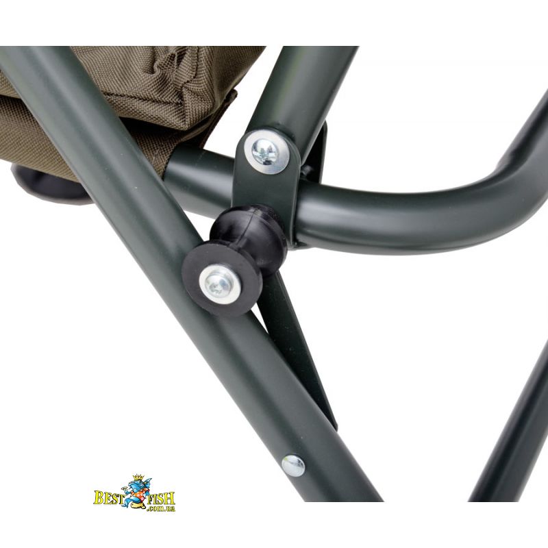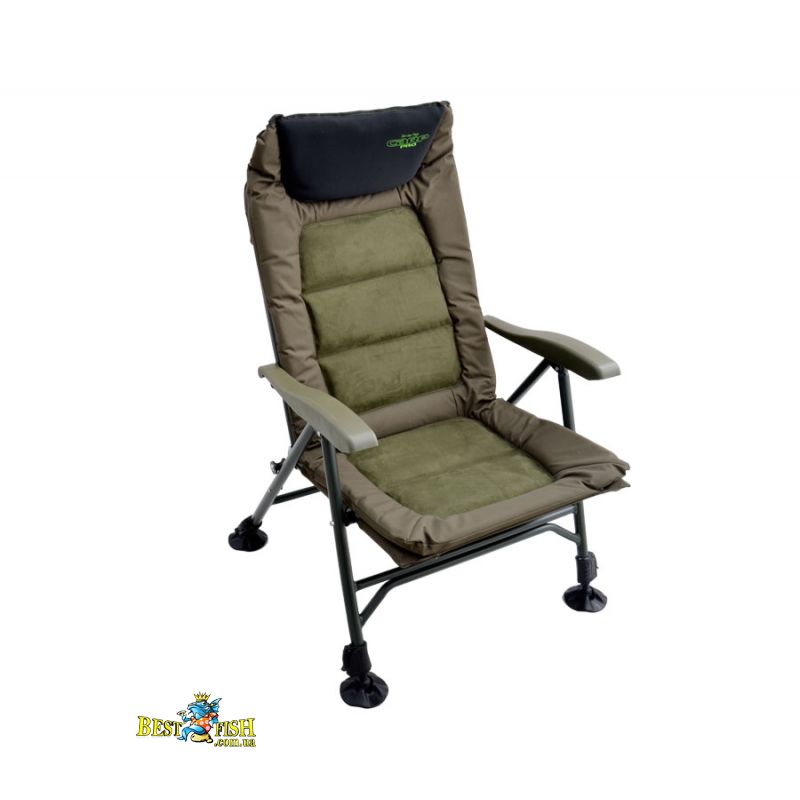Складное кресло, обеспечивающее высокий уровень комфорта. Благодаря подголовнику и мягким вставкам на сиденье тело принимает естественное положение, способствующее расслаблению и отдыху. Ножки имеют регулируемую длину, которая позволяет устанавливать кресло на неровном рельефе. Широкие пятки на ножках не дают креслу проваливаться в грунт. Величина наклона спинки регулируется, фиксаторами выступают подлокотники, благодаря чему регулировку можно выполнить быстро и не вставая с кресла.