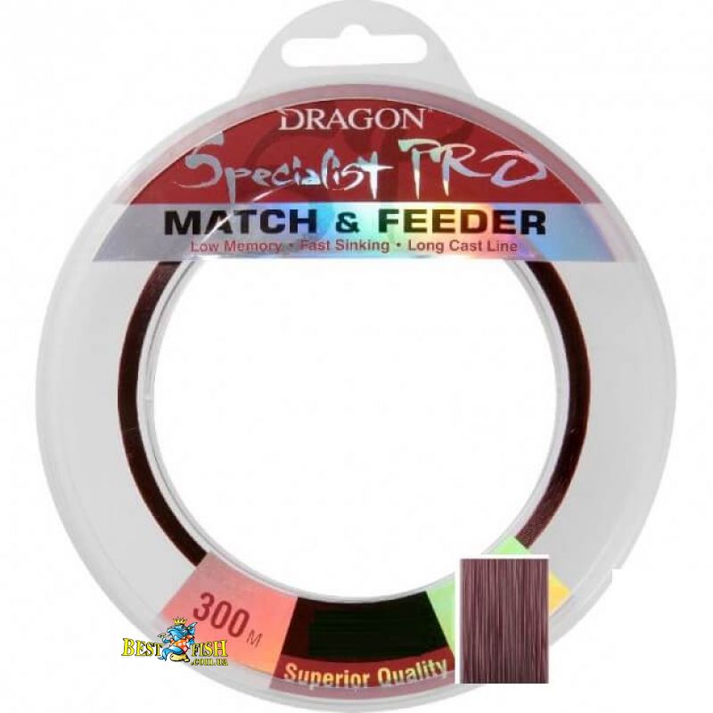 Волосінь Dragon Specialist Pro Match & Feeder - спеціалізована волосінь для лову й матчевої риболовлі. Це одна з найшвидших потопаючих лісок на риболовецькому ринку. Додатковим перевагою є її невелика розтяжність, що дозволяє зробити результативну підсічку з дуже великої дистанції. Темно-коричневий з бордовим відливом колір забезпечить відмінну маскування на тлі темного грунту.