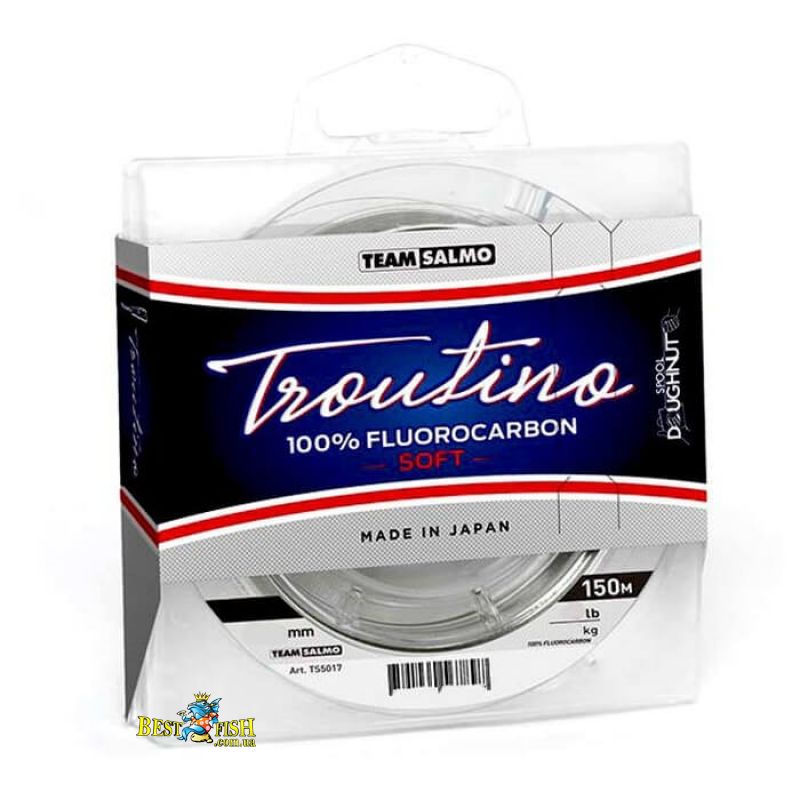 Team Salmo Fluorocarbon Troutino Soft - спеціальна волосінь з флюорокарбона розроблена для лову форелі і іншої обережної риби. Прозора безбарвна волосінь невидима для риби у воді. Матеріал м'який, зносостійкий, важча за воду і не видимий у воді. Флюорокарбон при зберіганні і використанні значно довговічніший будь-яких нейлонових лісок. Розмотування на високотехнологічні шпулі Doughnut по 150 метрів. Виготовляється і розмотується на спеціалізованому заводі в Японії.