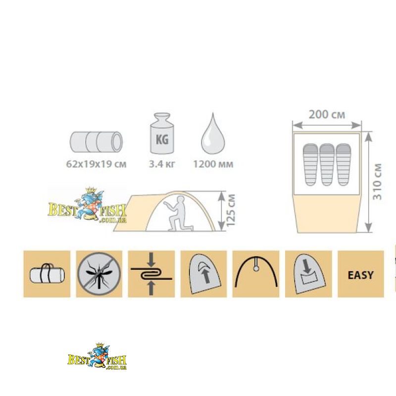 Палатка Holiday MAERO 3 - состоящая из внутренней палатки и тента. Все швы палатки проклеены. Возможна установка без тента. Палатка имеет просторный тамбур, один вход, укомплектованный противомоскитной сеткой и навесом. Также палатка имеет каркас из стекловолокна, вентиляционные окна, кольцо для подвесного фонаря, фиксатор для краев тента и карманы на стенках палатки.