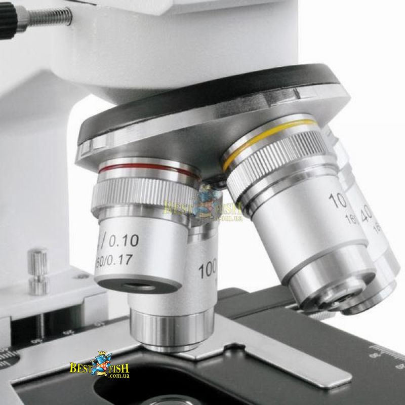 Для получения различных увеличений от 40х до 1000х используется комбинация из четырех объективов стандарта DIN (крепятся на револьверной головке с четырьмя посадочными местами) и пары окуляров. Максимальное увеличение объектива составляет 100х, благодаря чему достигается высокая степень реального оптического разрешения. Кроме того, этот объектив является иммерсионным, что способствует большей яркости и расширению пределов увеличения изображения, и сводит к минимуму оптические искажения (иммерсионное масло поставляется в комплекте).