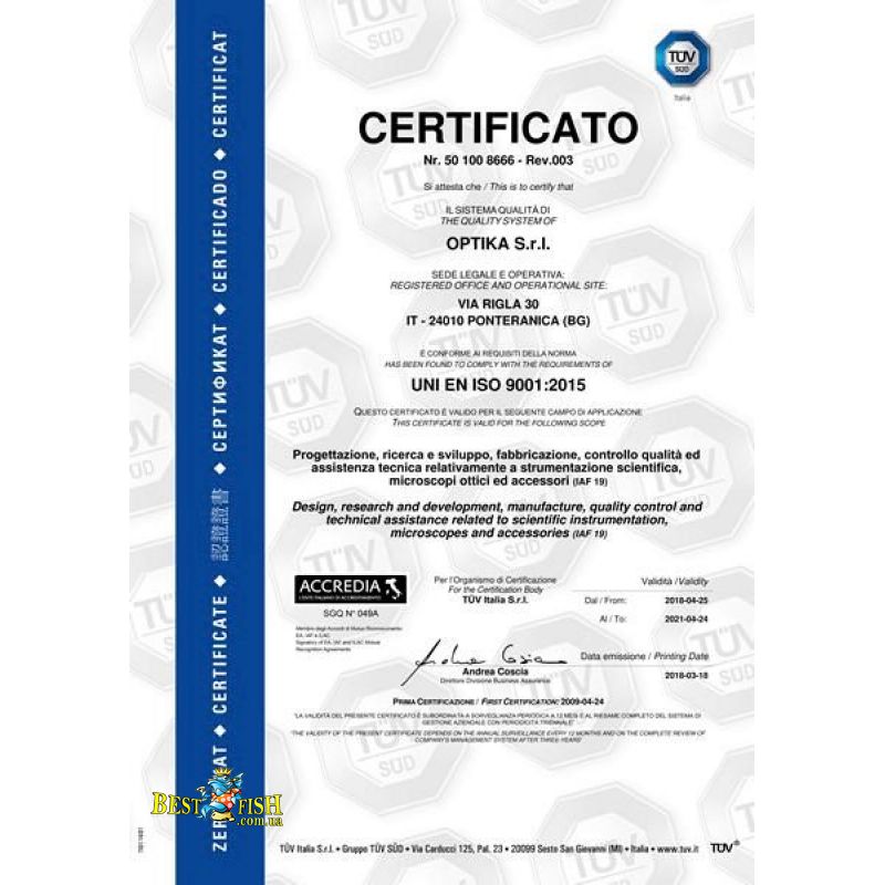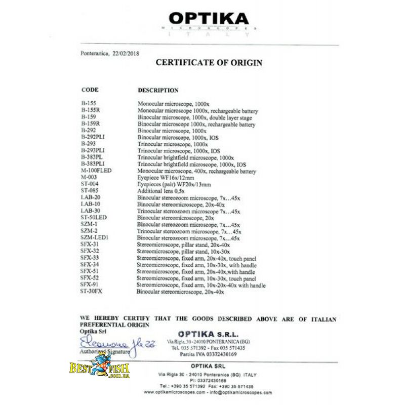 Вся продукция Optika SRL произведена в Италии. В небольшом городке Понтераника (провинция Бергамо) осуществляется разработка, производство и сборка микроскопов Optika. Каждый микроскоп сопровождается индивидуальным серийным номером, указанным на корпусе и в гарантийном талоне, а также отметкой о прохождении конечного контроля качества. Все изделия соответствуют основным требованиям соответствующих европейских директив ЕС и стандартам Европейского Союза.