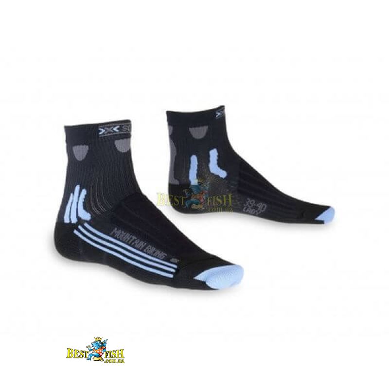 Чим складніше і різноманітніше ландшафт і рослинність, тим цікавіше гонка на гірському велосипеді, але і тим більший ризик отримати травму. Шкарпетки X-SOCKS® Mountain Biking Lady надають ефективний захист в будь-яких ситуаціях, враховуючи всі особливості будови жіночої ступні і не обмежуючи свободу рухів. Шкарпетки приємно сидять на нозі і ефективно управляють мікрокліматом всередині взуття. При виробництві шкарпеток застосовані технології ефективного захисту від порізів і ударів Shin Protectors при їзді через колючий чагарник або густий підлісок. Ваші щиколотки будуть надійно захищені системою Shin Protectors від забоїв, навіть якщо падіння з велосипеда буде неминучим. Бактеріостатична тканину Skin NODOR® перешкоджає розмноженню бактерій і поширенню неприємного запаху поту. Має гарну повітропроникністю, зносостійка, еластична і м'яка на дотик. Багатоцільова тканину Robur ™ складається з порожнистих волокон з герметичною повітряною камерою. Тканина дихаюча і еластичний. Захищає від ударних навантажень і тиску. Застосовується в зонах, особливо схильних до утворення потертостей і саден - ахіллове сухожилля, підошва, гомілковостопний суглоб, гомілка. Тканина Robur ™, зіткана з трижильний плетеної нитки, надзвичайно міцна і зносостійка. Mythlan ™ - ультралегкий, дихаючий матеріал з мікроволокнистого структурою. Найлегший серед високотехнологічних матеріалів. Тканина Mythlan ™ не накопичує вологу і сприяє ефективному процесу її випаровування з зовнішньої поверхні. Має нейтральне значення pH і гіпоалергенна.