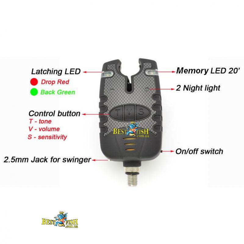 Набір сигналізаторів клювання Fishing Roi 4 + 1 в пластиковому кейсі, дуже якісний і не дорогий. Сигналізатори з пам'яттю, функціонують навіть у сильний дощ. При клюванні включається один світлодіод, якщо клювання триває то загоряється ще один, має підключається функцію вібрації пейджера в момент клювання, дуже зручно при нічній рибалці. Пейджер ловить приблизно до 150 метрів. Колір чорний із вставками карбону.