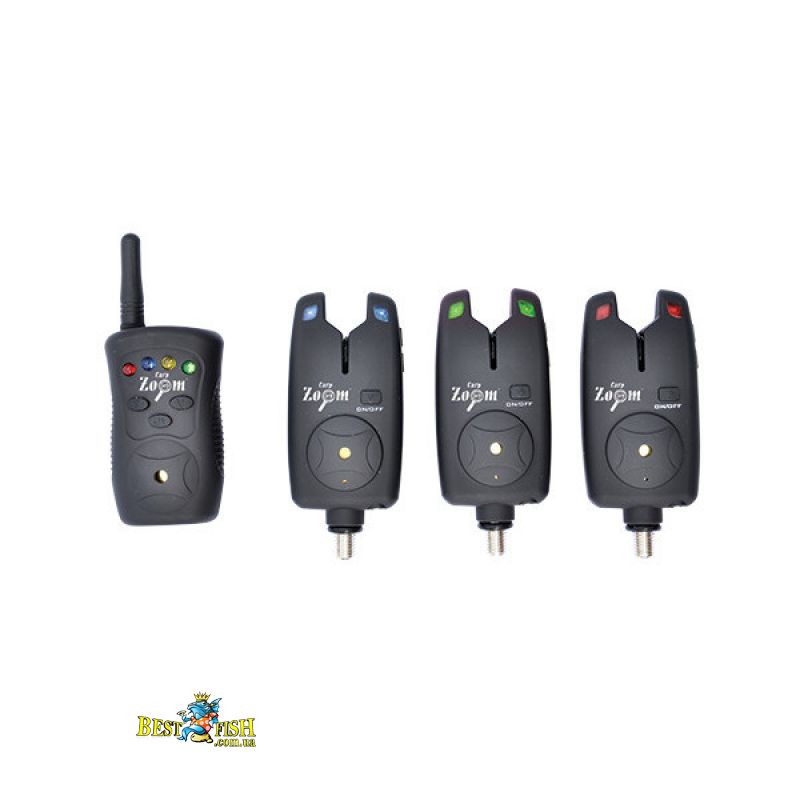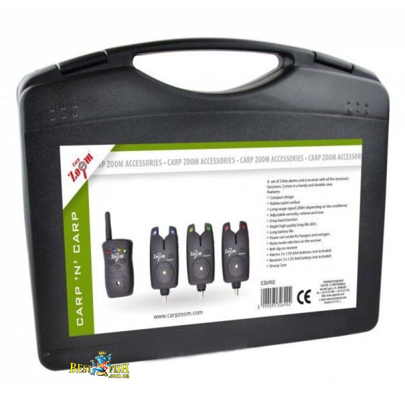 Порадує якісним виконанням і функціональністю любителів коропового лову. Прорезиненная поверхню сигналізаторів, дозволить їх використовувати навіть у тому випадку, якщо рибалка відбувається під дощем. Також ви можете індивідуально регулювати чутливість сигналізатора, що дозволяє використовувати набір на водоймах де присутня невелика течія. Світлове оповіщення клювання забезпечують яскраві світлодіоди, які прослужать вам безвідмовно велика кількість рибалок. У сигналізаторів обладнано роз'ємом для роботи з свінгерами. У разі якщо ви перебуваєте від вудилищ на значній відстані, ви не пропустите клювання завдяки спеціальному пейджера, який вас сповістить в разі спрацювання сигналізатора. Діапазон дії сигналу близько 200 метрів і залежить від місцевості. Поставляється набір в міцному кейсі.