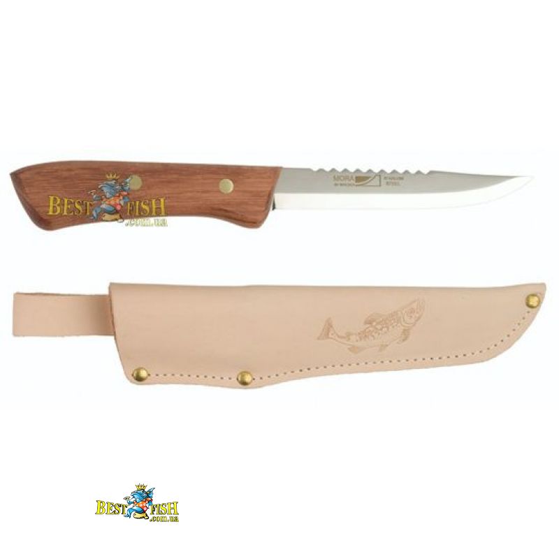 Нож Mora Fishing Classic нож классической формы производится для рыболовов более 50 лет. Лезвие ножа имеет зубчатый обух для чистки рыбы. Лезвие изготовлено из холоднокатаной нержавеющей стали фирмы Sandvik. У ножа удобная и особопрочная рукоятка из красного дерева bubinga. Ножны изготовлены из светлой натуральной кожи с изображением лосося.Длина лезвия (мм) - 125