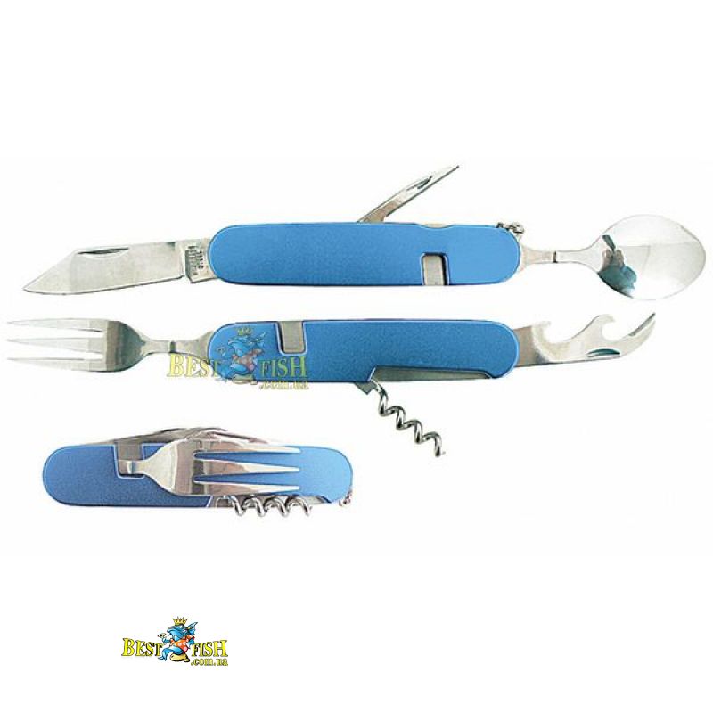 Нож складной с набором столовых инструментов. Нож туристический складной с набором столовых инструментов: вилки и ложки, дополнительно имеет открывалку для бутылок и банок, штопор и шило. На корпусе ножа имеется колечко для его закрепления с целью исключения потери.