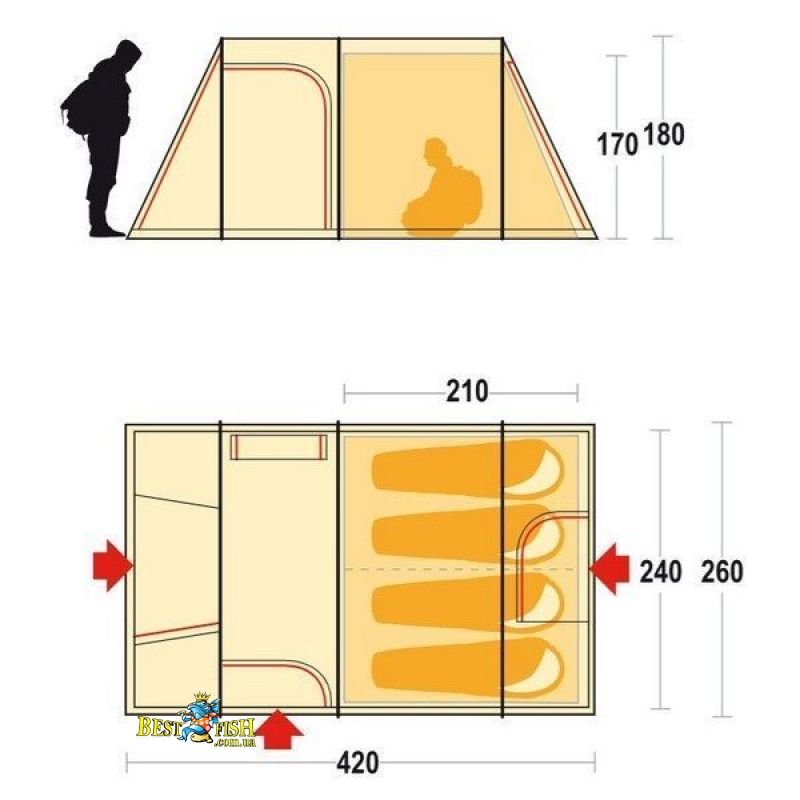 - Усередині намет розділяється на 2 приміщення знімною текстильної перегородкою