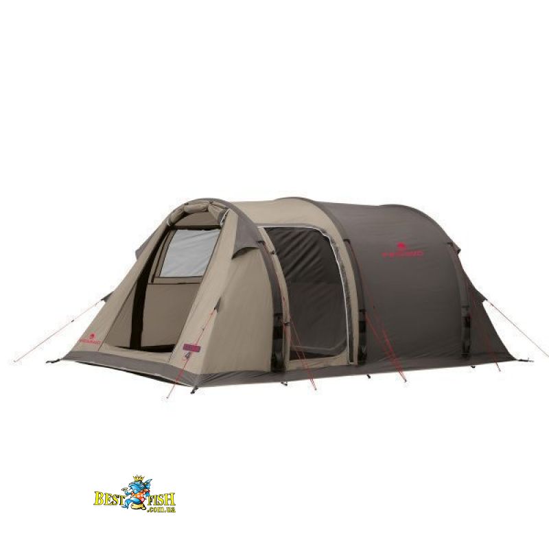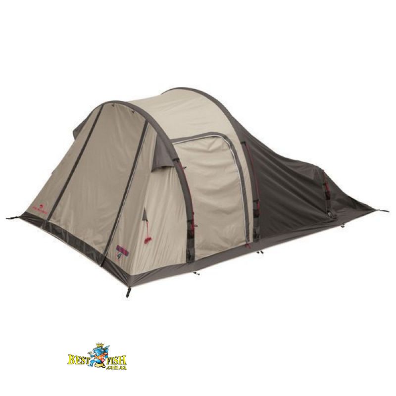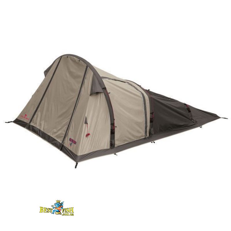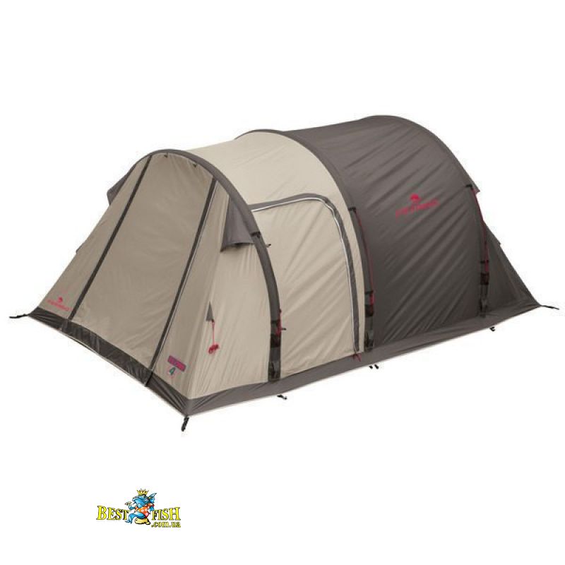 Сьогодні намети з надувним каркасом є синонімом зручності відпочинку на природі, і міцно асоціюються з комфортним кемпінгом. Намет Flow 4 Brown відноситься до серії сімейних наметів Ferrino і не залишить байдужими більшість цінителів зручності відпочинку під відкритим небом. Конструкція каркаса складається з трьох незалежних надувних арок, до яких вже приєднані зовнішній тент і внутрішній намет, що в рази прискорює і спрощує установку. Досить кількох хвилин, щоб привести намет в робоче положення за допомогою насоса. Три окремі входи виділяють цю модель серед багатьох інших кемпінгових наметів, значно спрощуючи і роблячи більш комфортним тривале проживання в ній. Flow 4 Brown має великий тамбур з двома дверима, де можна облаштувати невелику похідну кухню, розташувати розкладне ліжко, або поставити стільці для відпочинку. Чотири вентиляційних вікна, і наявність москітної сітки всіх дверей внутрішнього намету і бічних дверей зовнішнього тенту гарантують комфортний мікроклімат і відсутність комах в наметі. Додатковий комфорт надає перегородка, що розділяє внутрішній намет на два приміщення. З огляду на двошарову конструкцію, двоточкову систему штормових відтяжок і наявність статі по всьому периметру намету, ступінь водозащити цілком достатня, щоб, при правильній установці, зберегти намет всередині сухий під час дощу. Чохол намети закривається на блискавку, що дуже зручно при упаковці намети.
