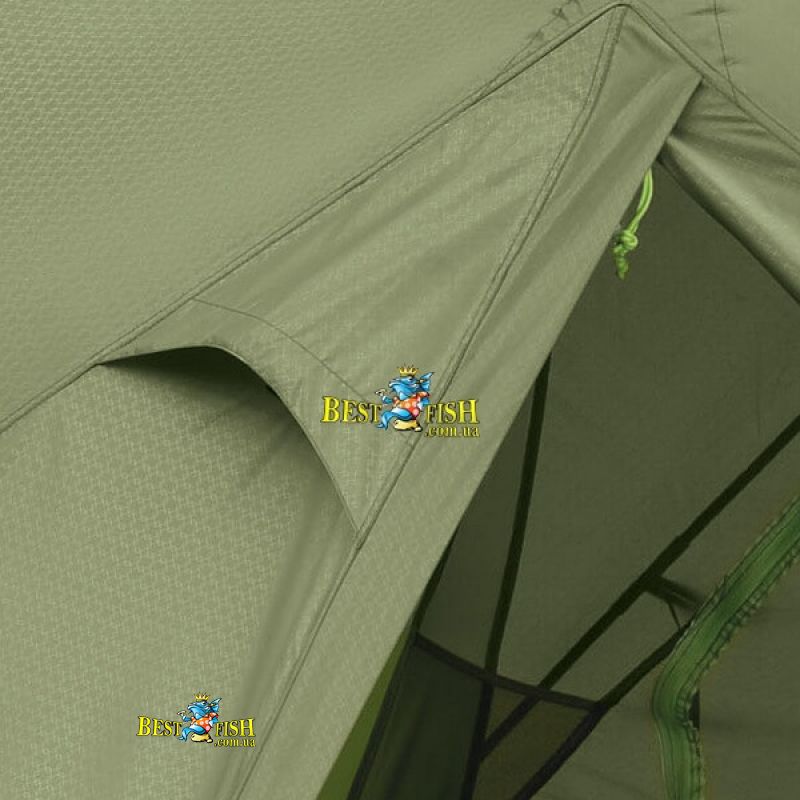 • Конструкцией предусмотрено два вентиляционных окна, расположенных со стороны входов в палатку. Их особенностью является возможность закрывать окна не только снаружи, но и изнутри. Система вентиляции Camera Air создает большую воздушную камеру между внешним тентом и внутренней палаткой, которая содействует свободной циркуляции воздуха вокруг внутренней палатки. С одной стороны это избавляет от появления конденсата внутри, а с другой стороны воздух является лучшей теплоизоляционной прослойкой.