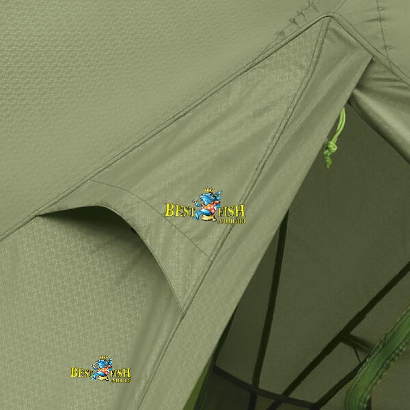 • Конструкцией предусмотрено два вентиляционных окна, расположенных со стороны входов в палатку. Их особенностью является возможность закрывать окна не только снаружи, но и изнутри. Система вентиляции Camera Air создает большую воздушную камеру между внешним тентом и внутренней палаткой, которая содействует свободной циркуляции воздуха вокруг внутренней палатки. С одной стороны это избавляет от появления конденсата внутри, а с другой стороны воздух является лучшей теплоизоляционной прослойкой.