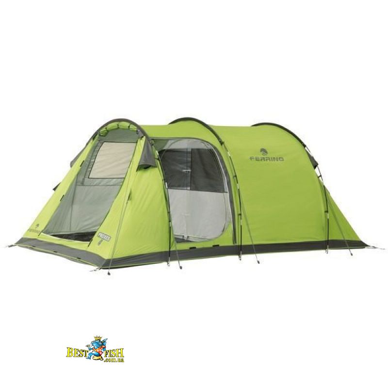 Палатка Proxes 4 Kelly Green относится к серии семейных палаток Ferrino и будет интересна для любителей кемпинга, путешествующих пешком или на общественном транспорте, так как при достаточно большом внутреннем пространстве ее относительно небольшой вес позволяет носить палатку за плечами. Три отдельных входа выделяют эту модель среди многих других кемпинговых палаток, значительно упрощая и делая более комфортным длительное проживание в ней. Несмотря на небольшой размер, эта модель имеет вместительный тамбур с окном, где можно обустроить походную кухню, расположить раскладную кровать, либо поставить пару стульев для отдыха. Четыре вентиляционных окна, и наличие москитной сетки дверей внутренней палатки и внешнего тента гарантируют комфортный микроклимат без насекомых в палатке. Дополнительный комфорт предоставляет перегородка, разделяющая внутреннюю палатку на два помещения. Учитывая двухслойную конструкцию, двухточечную систему штормовых оттяжек и наличие пола по всему периметру палатки, степень водозащиты вполне достаточна, чтоб, при правильной установке, сохранить палатку внутри сухой во время дождя. Чехол палатки закрывается на молнию, что очень удобно при упаковке палатки.